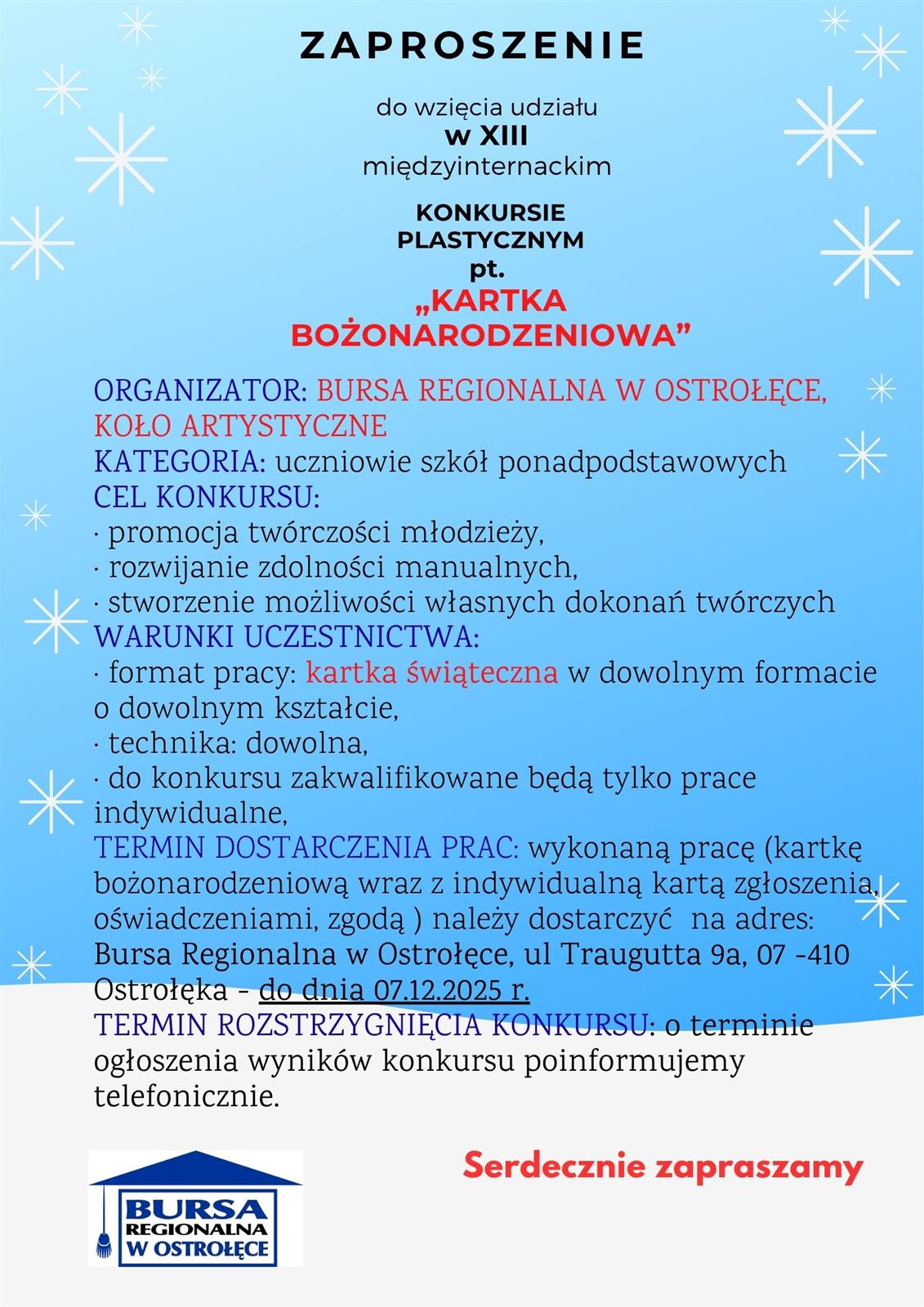 Koło Artystyczne działające w Bursie Regionalnej w Ostrołęce serdecznie zaprasza uczniów szkół ponadpodstawowych do udziału w XIII Międzyinternackim Konkursie Plastycznym pt. „KARTKA BOŻONARODZENIOWA”