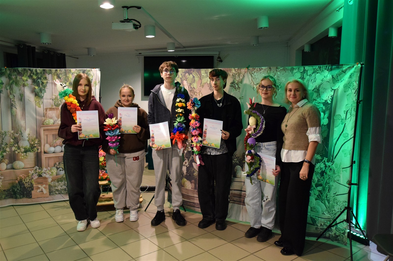 Pięcioro wychowanków Bursy Regionalnej w Ostrołęce stoi w rzędzie . W rękach trzymają różnokolorowe palmy wielkanocne (kurpiowskie) oraz dyplomy za udział w III międzyinternackim konkursie plastycznym na „Palmę Wielkanocną”. Za nimi znajduje się po obu stronach płótno z namalowanymi ozdobami wiosenno-wielkanocnymi: kolorowe pisanki, kwiaty, zajączki, bazie).