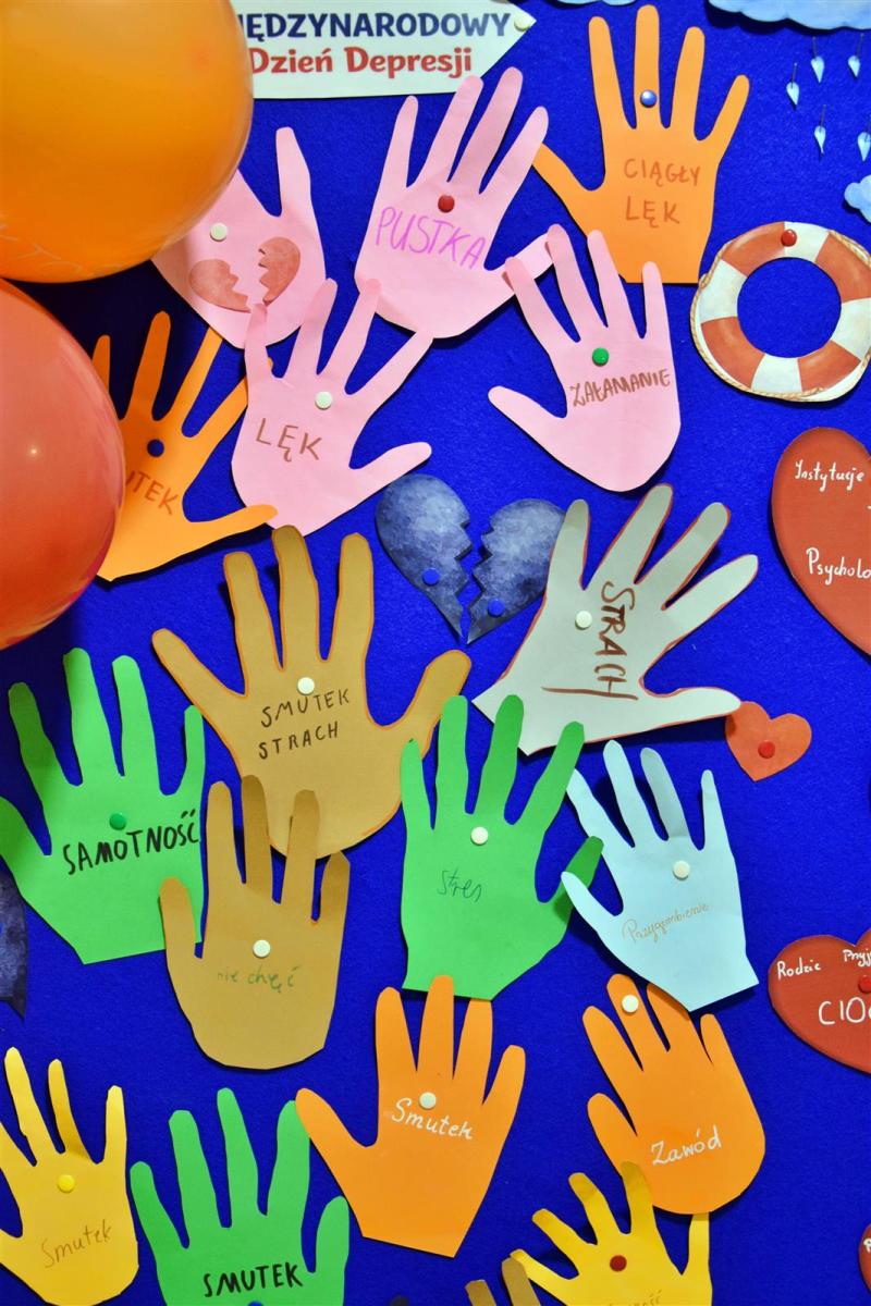 W części plastycznej powstały wyjątkowe i poruszające prace. W ramach zadania „Jak się czuję w kryzysie?” wychowankowie odrysowali i wycięli kształty swoich dłoni, na których zapisali słowa opisujące emocje towarzyszące osobie zmagającej się z depresją – m.in. smutek, samotność, bezradność, lęk, zagubienie, ale także nadzieję i potrzebę wsparcia.