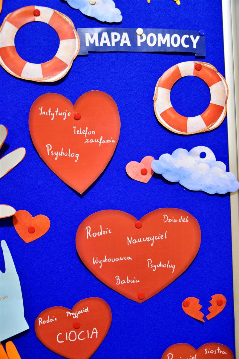 Powstała również „Mapa wsparcia”. Na wyciętych sercach wychowankowie zapisali osoby i instytucje, do których zwróciliby się o pomoc w trudnej sytuacji. Wśród odpowiedzi znaleźli się: rodzice, przyjaciele, wychowawcy, pedagog, psycholog oraz osoby zaufane. Ćwiczenie to podkreśliło, jak ważne jest budowanie relacji i świadomość, że nikt nie musi pozostawać sam ze swoim problemem.